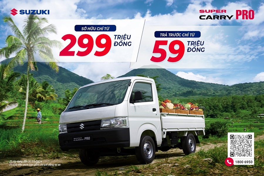 Đối với “vua” tải nhẹ Carry Pro, Việt Nam Suzuki áp dụng mức ưu đãi 100% lệ phí trước bạ và 0% lãi suất trong 6 tháng cùng phiếu nhiên liệu 5 triệu đồng. Theo đó, khách hàng chỉ cần đầu tư từ 299 triệu đồng để sở hữu Carry Pro với giá trả trước từ 59 triệu trong tháng 03.